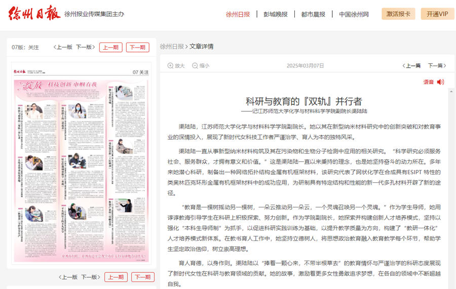 徐州日报3月7日报道威尼斯官网化学与材料科学学院渠陆陆教授科研与教育事迹,报道内容如下: