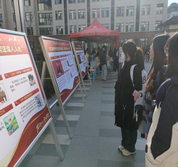 校内慕水广场、惠馨苑甬道进行宪法宣传,有奖答题环节以宪法条文、法治常识为题库,吸引学子踊跃参与;法律咨询台由学生志愿者值守,为全校师生解答疑问;宣传页则系统梳理宪法核心要义与国家宪法日意义,营造“人人学宪法、人人守宪法”的浓厚氛围,让宪法日成为“普法日、教育日、深化日”。