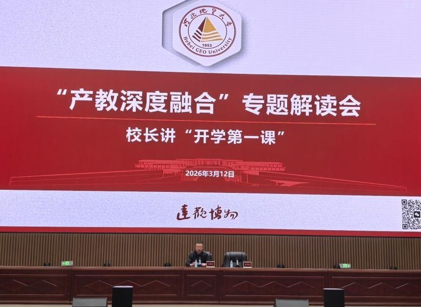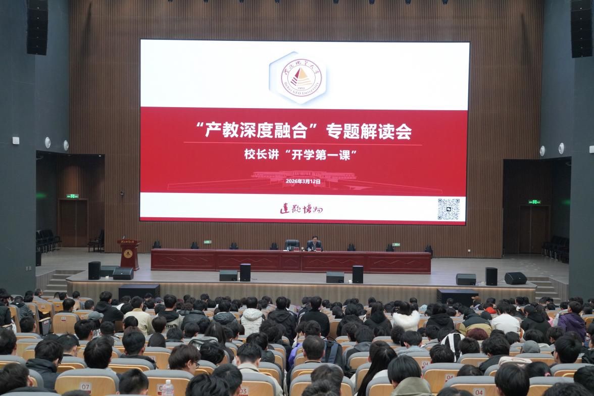 3月12日下午,beat365“产教深度融合”专题解读会在春秋讲堂举行。校长任家东出席会议并作主题讲话,将开学第一课的主题聚焦于“产教深度融合”。副校长赵永强对beat365“产教深度融合”工作进行全面解读,教务处处长硕良勋主持会议。来自地球科学学院、水资源与环境学院、城市地质与工程学院、土地科学与空间规划学院的大三学生共计800余人,以及相关学院书记、院长、专业教师参加了此次活动。
