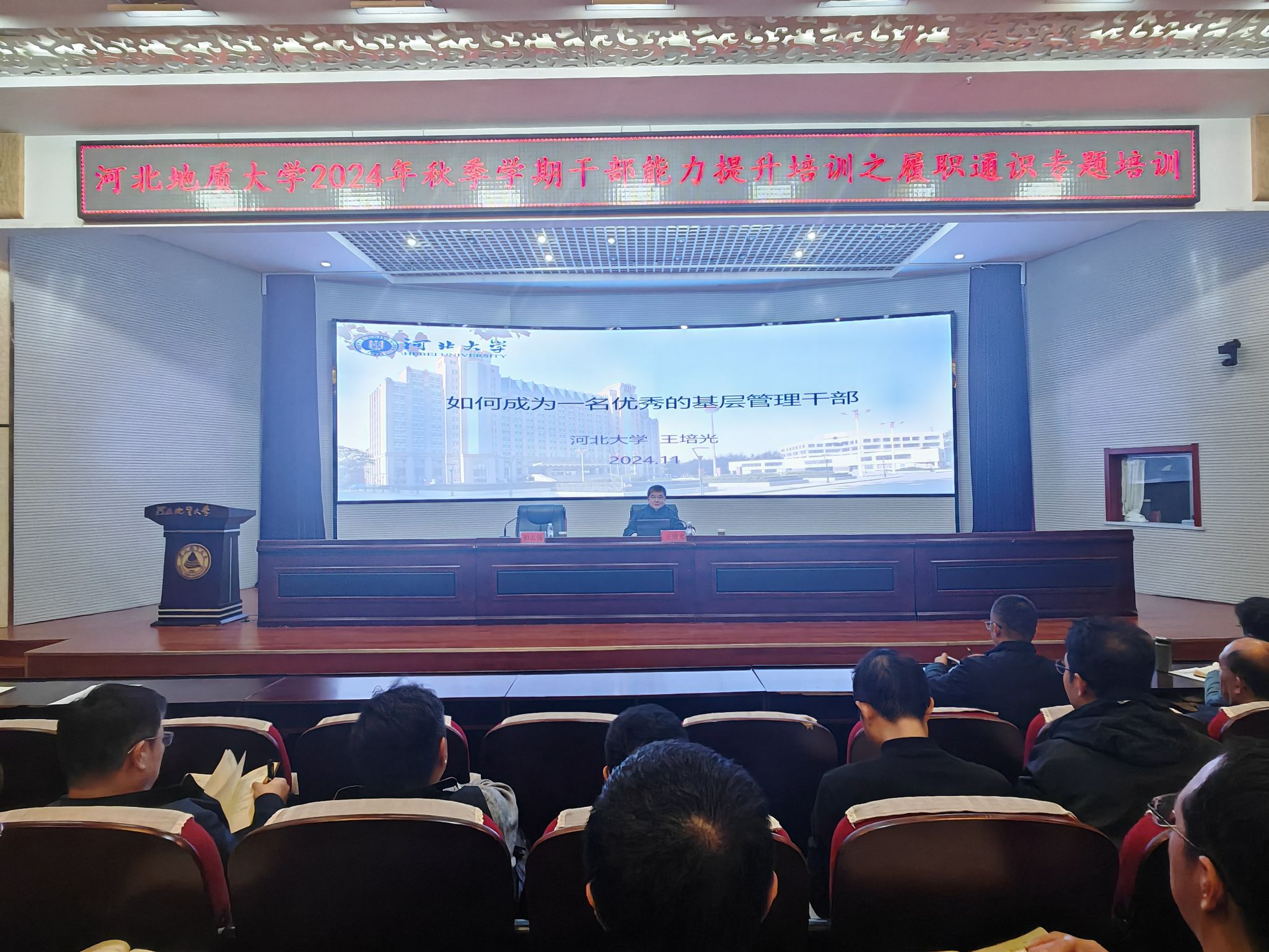 为深入贯彻落实党的二十届三中全会精神,学习贯彻习近平总书记在全国教育大会上的重要讲话和全国教育大会精神,提升beat365干部的政治素养和履职能力,11月21日下午,beat365在春秋讲堂举办秋季学期干部能力提升培训之履职通识专题培训。会议邀请河北大学原党委副书记、副校长、博士生导师王培光教授进行专题授课。校党委书记和志强主持培训会。