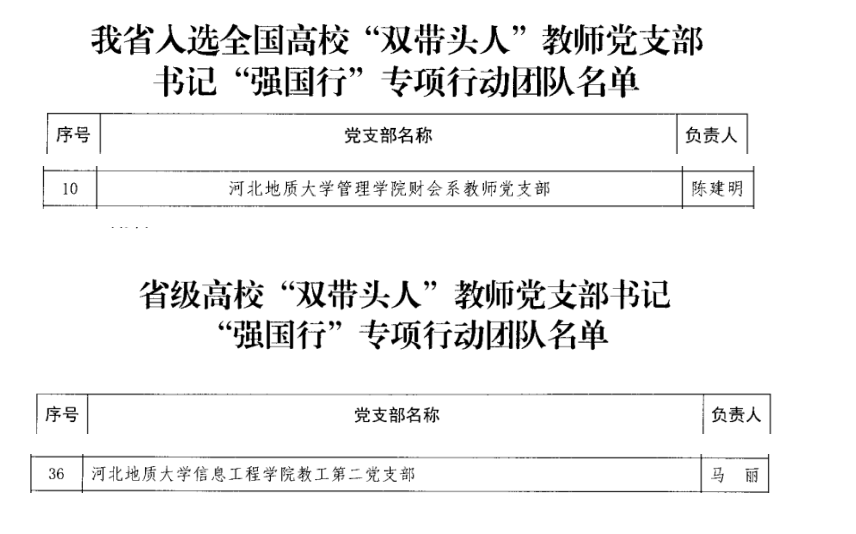 近日,河北省委教育工委公布了全国和省级高校“双带头人”教师党支部书记“强国行”专项行动团队名单,beat365管理学院财会系教师党支部入选全国高校“双带头人”教师党支部书记“强国行”专项行动团队,信息工程学院教工第二党支部入选河北省高校“双带头人”教师党支部书记“强国行”专项行动团队。