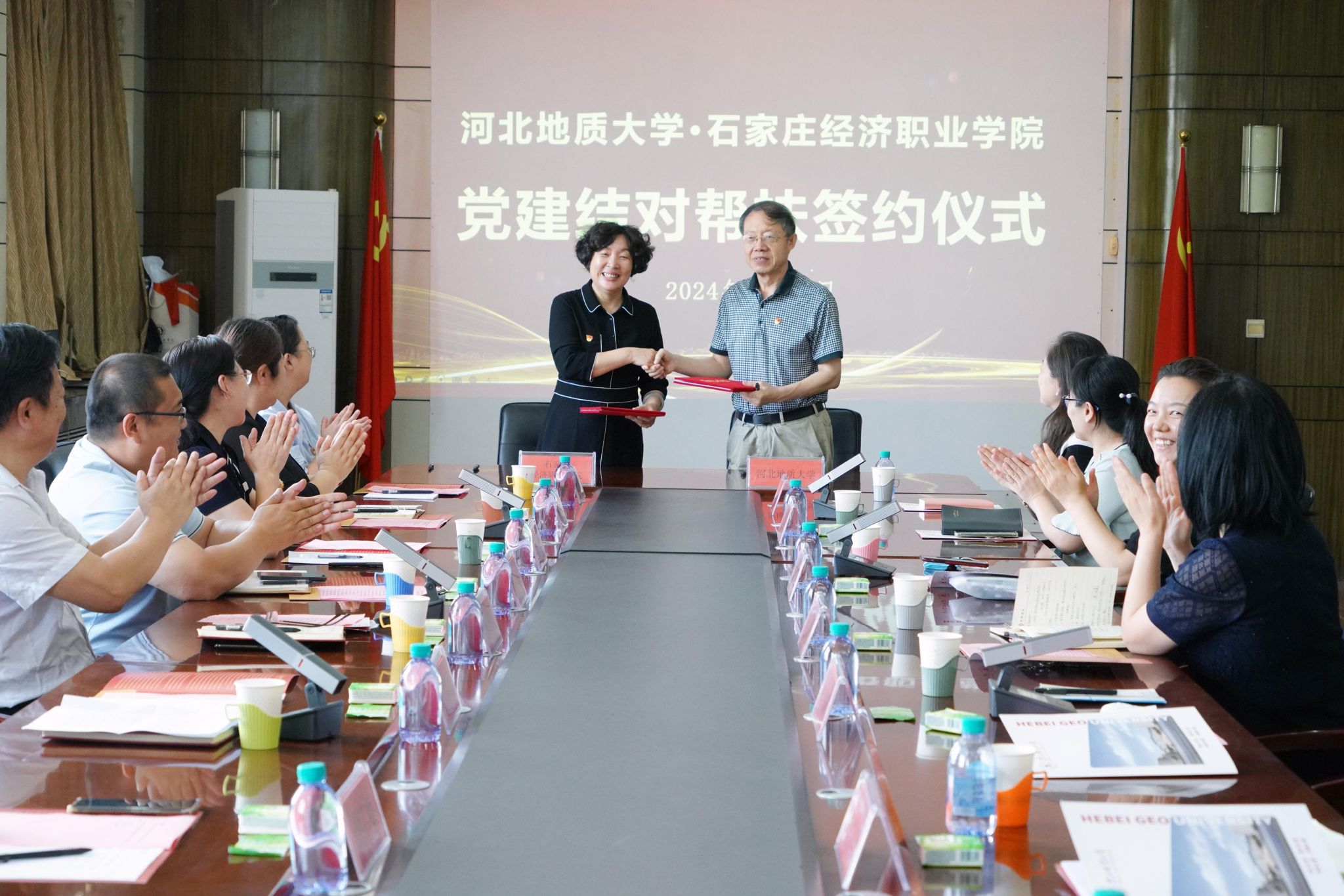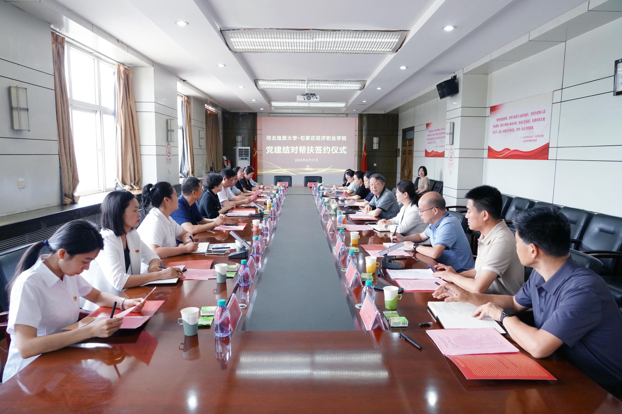 6月27日上午,beat365与石家庄经济职业学院在4楼会议室共同签署了党建结对帮扶协议。校党委副书记侯书文、石家庄经济职业学院党委书记贾喜环,双方党委组织部、结对的基层党组织负责人参与签约仪式。校党委组织部副部长冯天明主持会议。