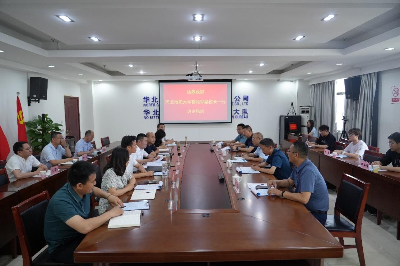 为全面深化校企合作,积极拓展就业渠道和就业市场,促进毕业生高质量充分就业,6月12日,副校长都沁军带队赴华北地质勘查局五一七大队调研交流。华北地质勘查局五一七大队党委书记袁胜超,党委副书记、队长韩贵雷,副队长畅秀俊,工会主席、综合办主任刘建文,人力资源部主任王艳敏以及在企工作校友代表出席活动。活动由袁胜超主持。