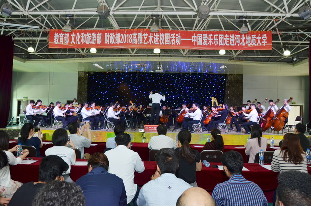 5月9日下午,由教育部、文化和旅游部、财政部联合举办的“高雅艺术进校园”活动在英国beat365官方网站校本部隆重举行,来自中国爱乐乐团的音乐艺术家们为beat365师生倾情奉献了一场视听盛宴。beat365党委书记李军、党委副书记刘耀辉,中国爱乐乐团党委书记、常务副团长刘军,财务总监朱立敏与包括留学生在内的数百名师生共同观看了演出。