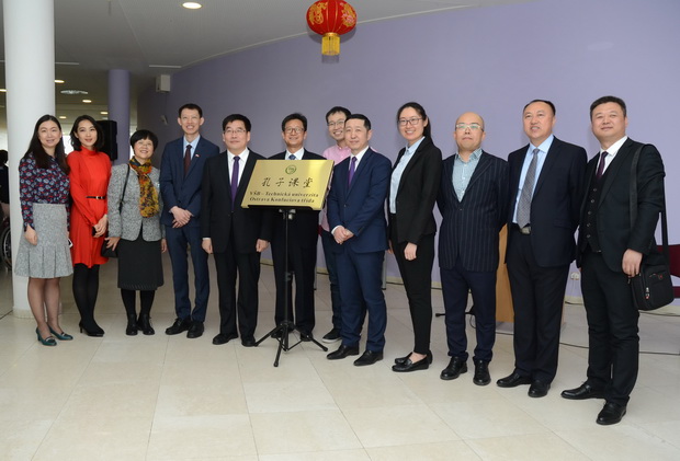 中午12点,孔子课堂的揭牌仪式正式开始。王凤鸣发表了主题演讲,并和奥斯特拉发技术大学校长一起为孔子课堂揭牌。王凤鸣表示,孔子课堂不仅仅应当成为中文教学和中国文化传播的平台,更应当在“一带一路”的大背景和“16+1”的大框架下,发挥更加积极和重要的作用,成为促进两校、两省甚至两国之间在高等教育、合作科研和经贸合作等广泛领域的交流与合作桥梁。