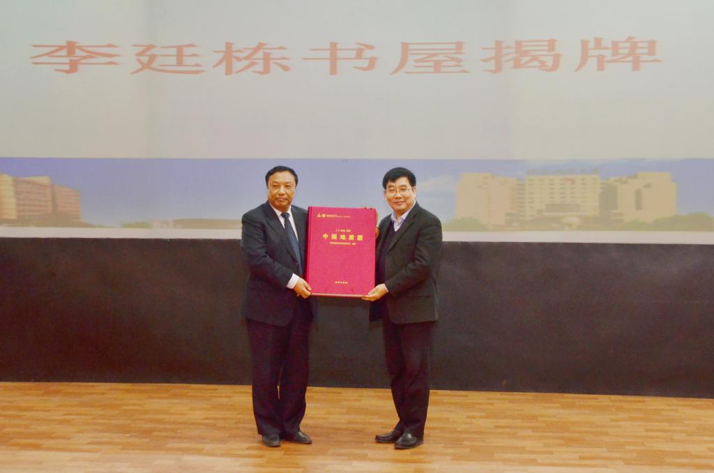 大会还举行了李廷栋书屋揭牌仪式,李廷栋院士把多年珍藏的近万册图书和地质图册捐赠给学校,其中不乏绝版外文书籍。侯增谦院士代表中国地质科学院地质研究所向李廷栋书屋捐赠了图书。王凤鸣校长为李廷栋院士、侯增谦院士颁发了捐赠证书。