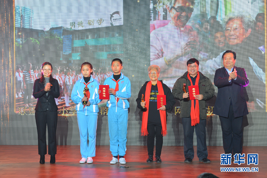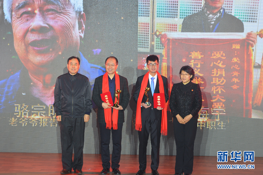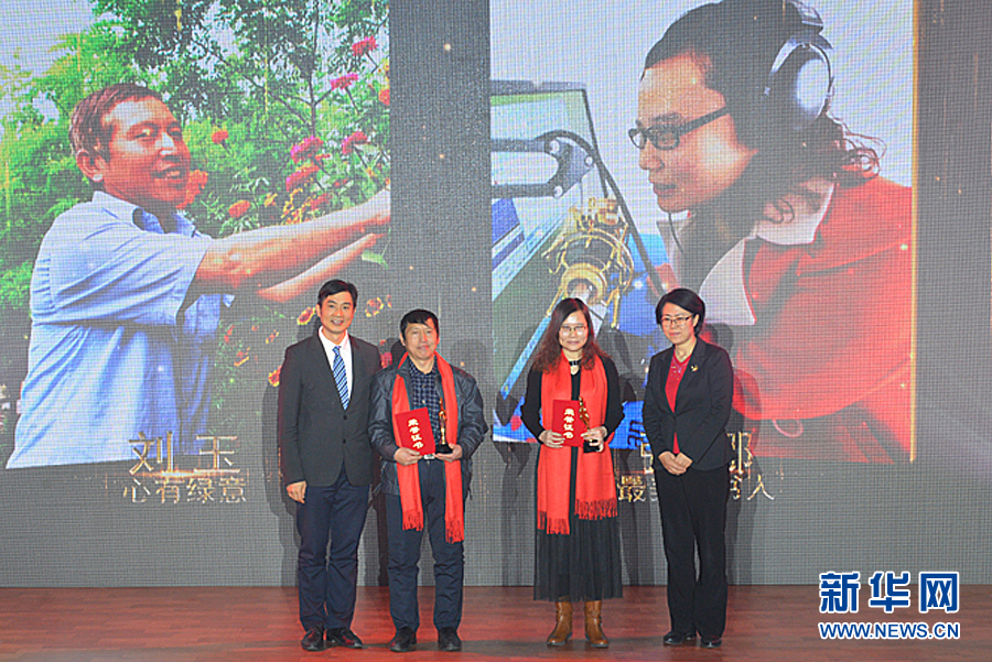 新华网副总裁申江婴(左一)和河北省教育厅党组副书记、副厅长韩俊兰(右一)为获奖人物刘玉、张娜颁奖。新华网王立鹏 摄