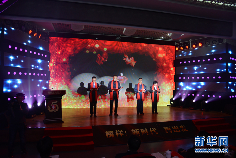 往届“中国网事 感动河北”年度网络人物段非、严爱国、苏俐、刘富琴共同登台朗诵诗歌《不忘初心 向善前行》。新华网秦家宝 摄