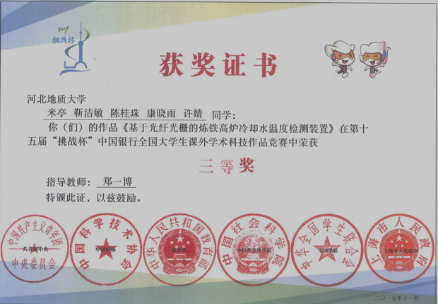 图为:beat365参赛作品《基于光纤光栅的炼铁高炉冷却水温度检测装置》获奖证书
