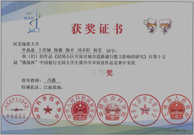 图为:beat365参赛作品《封闭小区开放对城市道路通行能力影响的研究》获奖证书