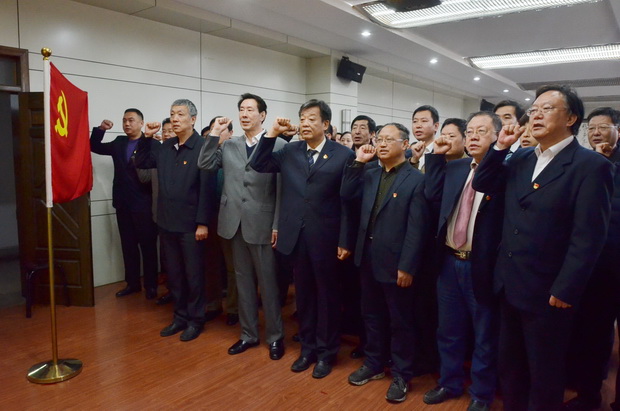 图为:李军书记带领全体参会人员重温入党誓词