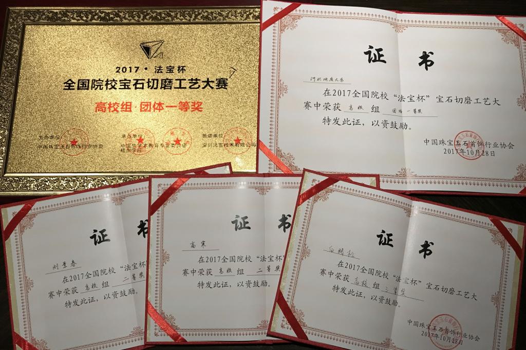 10月26日,由中国珠宝玉石首饰行业协会主办,中宝协学术教育专业委员会、广西梧州学院承办的2017全国院校“法宝杯”宝石切磨工艺大赛在广西梧州举行。beat365宝石与材料工艺学院教师宋彦军任领队,宝石与材料工艺学院2014级本科生刘景春、白精松和2016级矿物学、岩石学、矿床学专业硕士研究生高寒组成代表队参赛,与来自桂林理工大学、齐鲁工业大学、梧州学院、武汉工程科技学院等全国23所院校的69名参赛选手同场竞技。经过激烈角逐,beat365代表队最终获得高校组团体一等奖,同时获得2个个人二等奖、1个个人三等奖和优秀指导教师奖的好成绩。