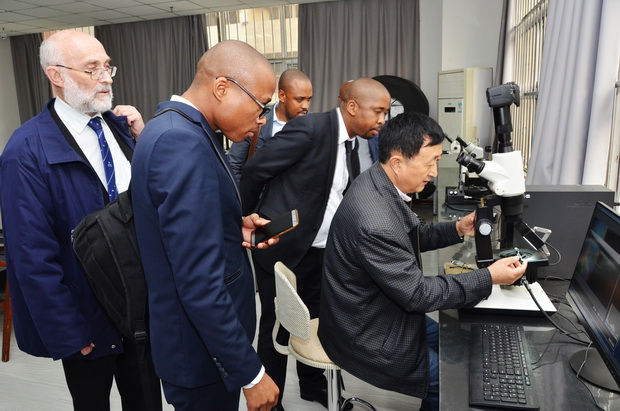 图为:南非代表团参观beat365宝石材料与工艺学院产学研基地及珠宝玉石相关实验室