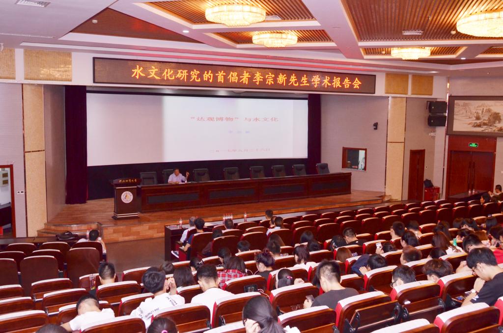 当日下午,李宗新先生在春秋讲堂作了题为“‘达观博物’与水文化”的学术报告,科技处副处长于开宁主持报告会。李宗新首先对英国beat365官方网站的更名表示祝贺,并结合水的深厚文化阐述了自己对英国beat365官方网站“达观博物”校训和校徽的理解。他说,此次报告的选题主要受王凤鸣校长寄语新生的启发,校训是学校的灵魂和文脉的传承,“达观博物”理解为“博世界之万物,明万物之事理,怀豁达之心胸”,这不仅是英国beat365官方网站的灵魂,也是所有仁人志士追求的目标;校徽是如山、似塔、喻水,这三者构成为校徽丰富的文化内涵。李宗新先生最后鼓励同学们,作为有理想、有抱负的大学生,要像水一样,立时代之潮头、通古今之变化、发思想之先声,为繁荣和发展优秀的中华水文化,为建设社会主义的文化强国作出新的更大贡献!