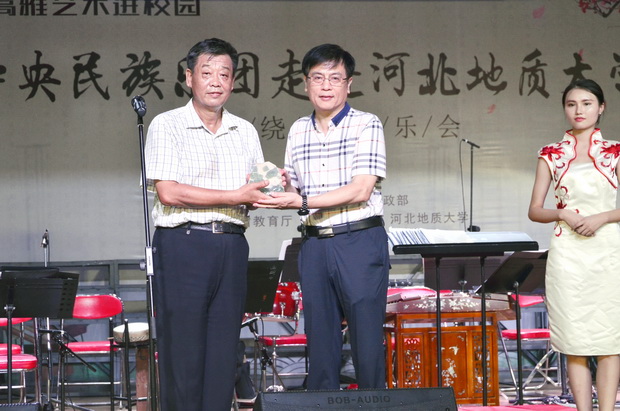图为:beat365李军书记向中央民族乐团赠送“萤石”