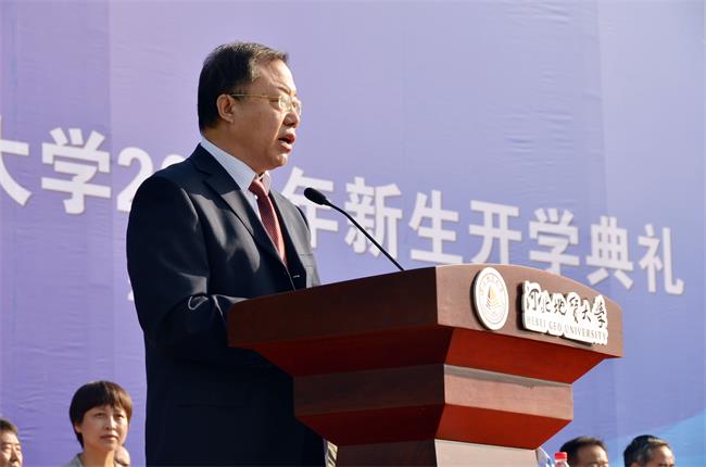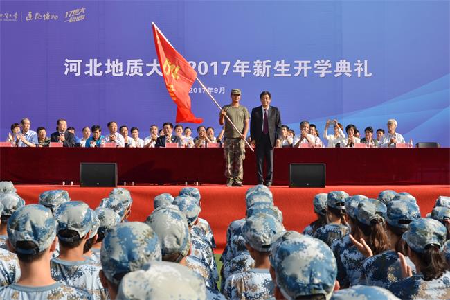 嘹亮的国歌声响起,全体起立,注视着鲜艳的五星红旗冉冉升起。在致辞中,王凤鸣对来自全国各地的4000余名新生表示热烈欢迎。王凤鸣指出,建校64年来,河北地大人薪火相传,积淀了深厚的文脉与底蕴,校训“达观博物”正是对这一传承的诠释。他期望同学们在未来把世界当作自己的大学。把世界当作大学,就是要成为具有世界眼光的人,把学校、石家庄、河北、中国乃至世界作为课堂,把他人作为课堂,“行万里路、读万卷书”,常仰山之高,知不足而好学,常慕水之善,见贤思齐,见不贤而内自省;就是要成为具有连接世界能力的人,希望大家成为具有宽厚人格和知识底蕴、拥有专深理论或技术、通过连接世界进而影响世界的A型人才。