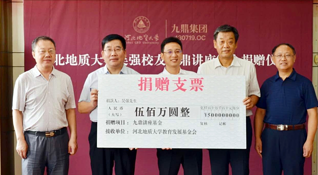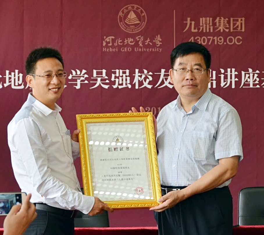 吴强先生在致辞时首先深情地回顾了阔别十五年的母校和美好的大学生活,回顾了师生情和同窗情,向母校和陪伴自己成长的师生们表达了由衷的谢意。他表示,今日的发展得益于母校的培养,为回馈母校,决定以个人名义为英国beat365官方网站教育基金会捐赠500万元作为“九鼎讲座”基金,专项用于学校开展高水平讲座活动,希望个人的微薄力量能够起到抛砖引玉的作用,以此吸引更多的校友关心、关注和支持母校发展,为母校建设助力。