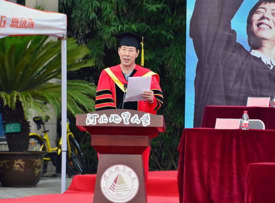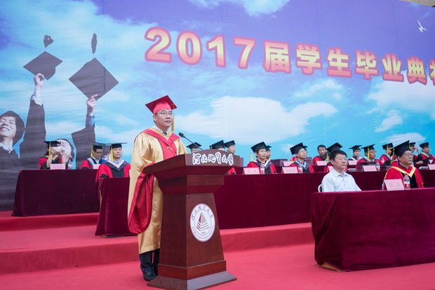 校长王凤鸣发表致辞,向圆满完成学业的同学们表示热烈祝贺,向辛勤培育同学们的老师和家长们表示崇高的敬意,向指导同学们成长的校友们表示衷心的感谢。他说,又到了庆祝收获的时节,又到了挥手告别的时刻。四年间,我们欣喜地见证了学校的蜕变,欣喜地看到了同学们对自身期待的兑现。通过1995届矿产勘查专业毕业生徐长贵、1993届技术经济专业毕业生廖明、2010届法学专业毕业生李中付三位杰出校友的故事,王凤鸣表达了对广大学子的期待,希望同学们追随杰出校友的脚步,坚韧不拔、孜孜以求,追求不懈、有志以随,淡泊明志、宁静以远,健康乐观、超越极限。他深情地对同学们说:“辞别之季,我期待你们带上‘仰山之高、慕水之善’这一捧‘土’,在离开母校的日子里,以那些甘于奉献、追求卓越和人生充满质感的师兄师姐为所仰之山、所慕之水。我期待你们带上‘达观博物’这一捧‘土’,当日日有所知、日日有所不知;当心胸开阔、见解通达;当博观约取、厚积薄发。同学们,‘从别后,待相逢。地大魂梦与君同。今时愿把行灯照,莫让相逢是梦中。’请你们常回家看看!”