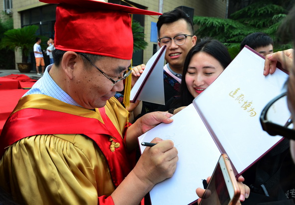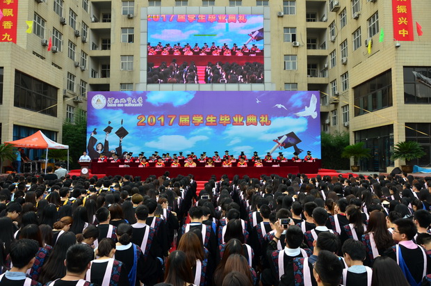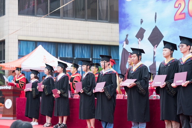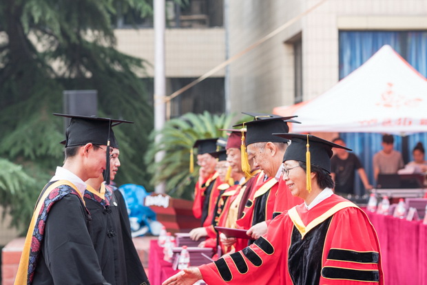 接着,学位授予仪式隆重举行,校领导和老师们首先为即将奔赴祖国西部建功立业的8名毕业生代表授学位。之后,2017届3177名本科生依次上台,各位导师为同学们拨苏正冠,颁发学位证书,并合影留念。