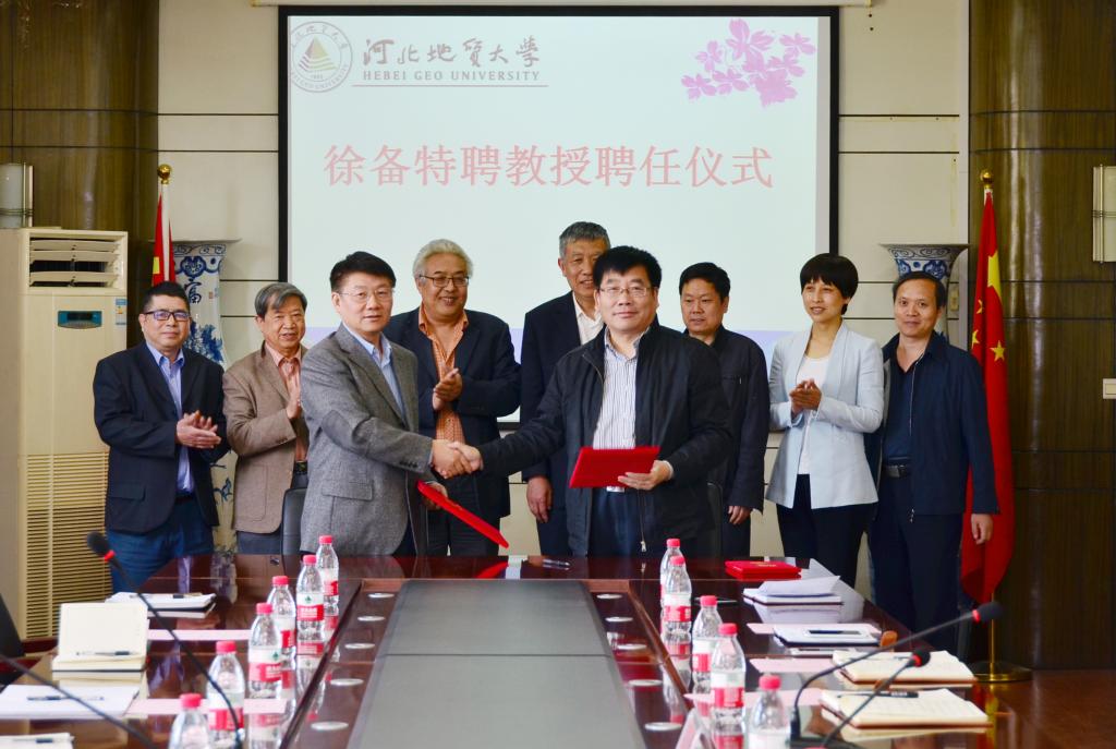 徐备教授发表讲话说:“很高兴也很荣幸再次回到母校工作,42年前我曾在河北地院工作过几年,对我们学校有着深厚的感情,如今重返母校并看到学校近年来取得的跨越式发展,令人振奋!今天受聘为学校特聘教授,我更有责任和义务为母校的发展做出贡献。今后我将尽我责任,着重在学科建设、科学研究、人才培养三个方面,为学校早日成为博士学位授权单位尽最大力量;做好学科建设及发展,带头做好学校学科项目的申请和项目研究等工作;发挥自身优势,积极带动并培养青年教师成长,做好人才队伍建设工作,提高学校在地质圈的影响力。我有信心帮助母校取得长足发展。”