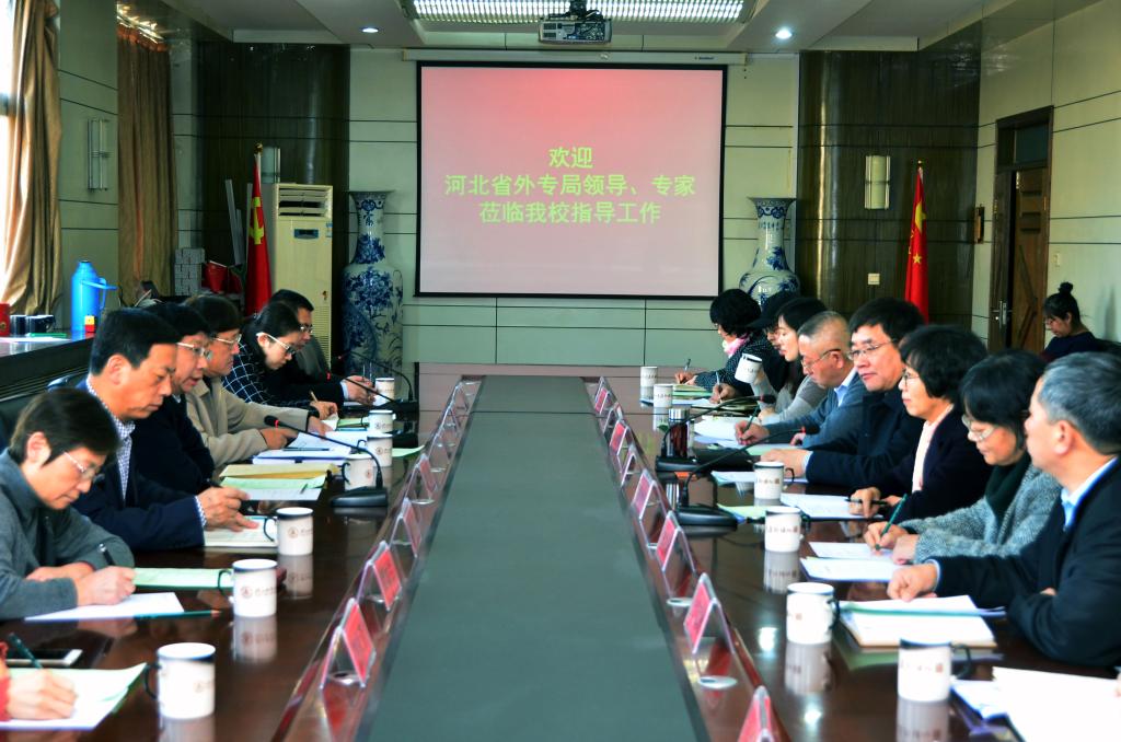 2月23日上午,河北省外国专家局局长王仲群、南非金雅迪国际交流服务中心副会长祁安全一行莅临beat365调研指导工作。校长王凤鸣、副校长张小平接待领导、专家一行并在主楼四楼会议室进行了座谈。beat365教务处、国际教育交流中心、研究生学院、经贸学院、资源学院等有关部门和单位负责人参加了座谈会。张小平主持会谈。