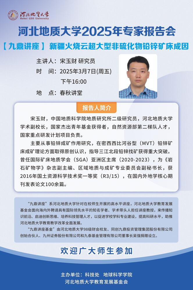 【专家河北行信息预告】“九鼎讲座”系列学术报告:新疆火烧云超大型非硫化物铅锌矿床成因