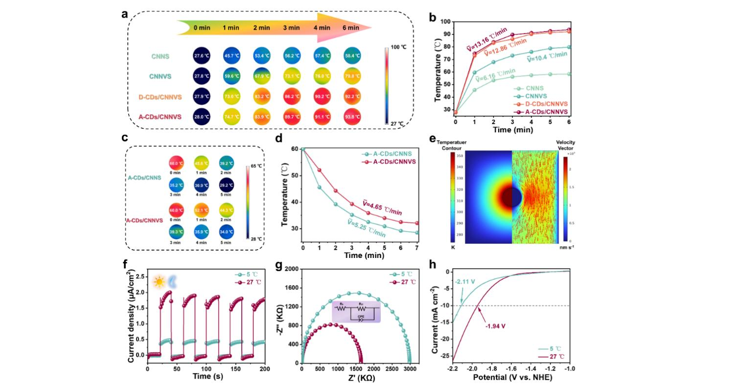 图3 (a) CNNS、CNNVS、D-CDs/CNNVS和A-CDs/CNNVS在全光谱照射下的时间-光热映射图像(室温:27 ℃)和 (b) 对应的温度变化曲线;(c) A-CDs/CNNS和A-CD/CNNVS光催化剂在5 min内的时间-降温映射图像和 (d) 温度衰减曲线;(e) 1800 s的照射下,单个A-CDs/CNNVS的温度分布和速度矢量的数值模拟;A-CDs/CNNS在不同温度下的 (f) 瞬态光电流响应曲线、(g) EIS图和 (h) LSV曲线
