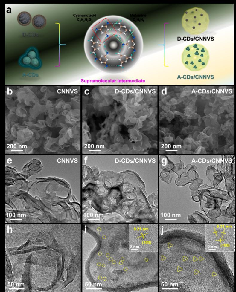 图1 (a) A-CDs/CNNVS和D-CDs/CNNVS复合光催化剂的制备工艺示意图;CNNVS的 (b) SEM图像、(e) TEM图像和 (h) HRTEM图像;D-CDs/CNNVS的 (c) SEM图像、(f) TEM图像和 (i) HRTEM图像;A-CDs/CNNVS的 (d) SEM图像、(g) TEM图像和 (j) HRTEM图像