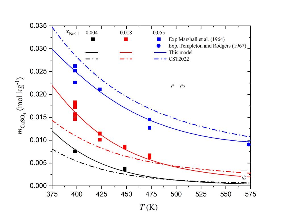 硬石膏矿物溶解度的研究在热液型矿床成矿规律、地热能源利用、CO2强化采油、湿法冶金、海水淡化等领域都具有非常重要的意义。高温高压条件下矿物溶解度的精确实验测量需要耗费大量物力和人力,现有的实验数据不论从精度上还是数量上都不完全能满足地球科学和相关工业研究的需要。适用范围宽、预测精度高的溶解度模型可以在人们感兴趣的物理化学条件下生成模拟数据。目前已有的硬石膏溶解度模型(Creaser, 2022, 图中表示为CST2022)与实验事实相比差距较大。与其它模型相比,本模型在宽广温度压力盐度范围内都具有更好的预测效果(部分图片如下)。