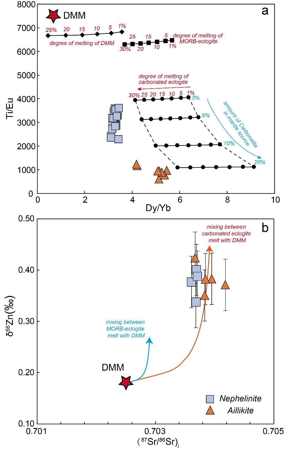 3、方解霞黄煌岩、霞石岩和霞石正长岩的Zn同位素特征、主、微量元素成分以及模拟结果表明,方解霞黄煌岩可能是起源于碳酸盐化榴辉岩的富钙质碳酸岩的硅酸盐熔体与地幔橄榄岩反应形成的,而霞石岩则是由起源于碳酸盐化榴辉岩的相对贫钙质碳酸岩的硅酸盐熔体与地幔橄榄岩反应形成的(图5,6),霞石正长岩是霞石岩原始岩浆经过分离结晶作用形成(图7)。