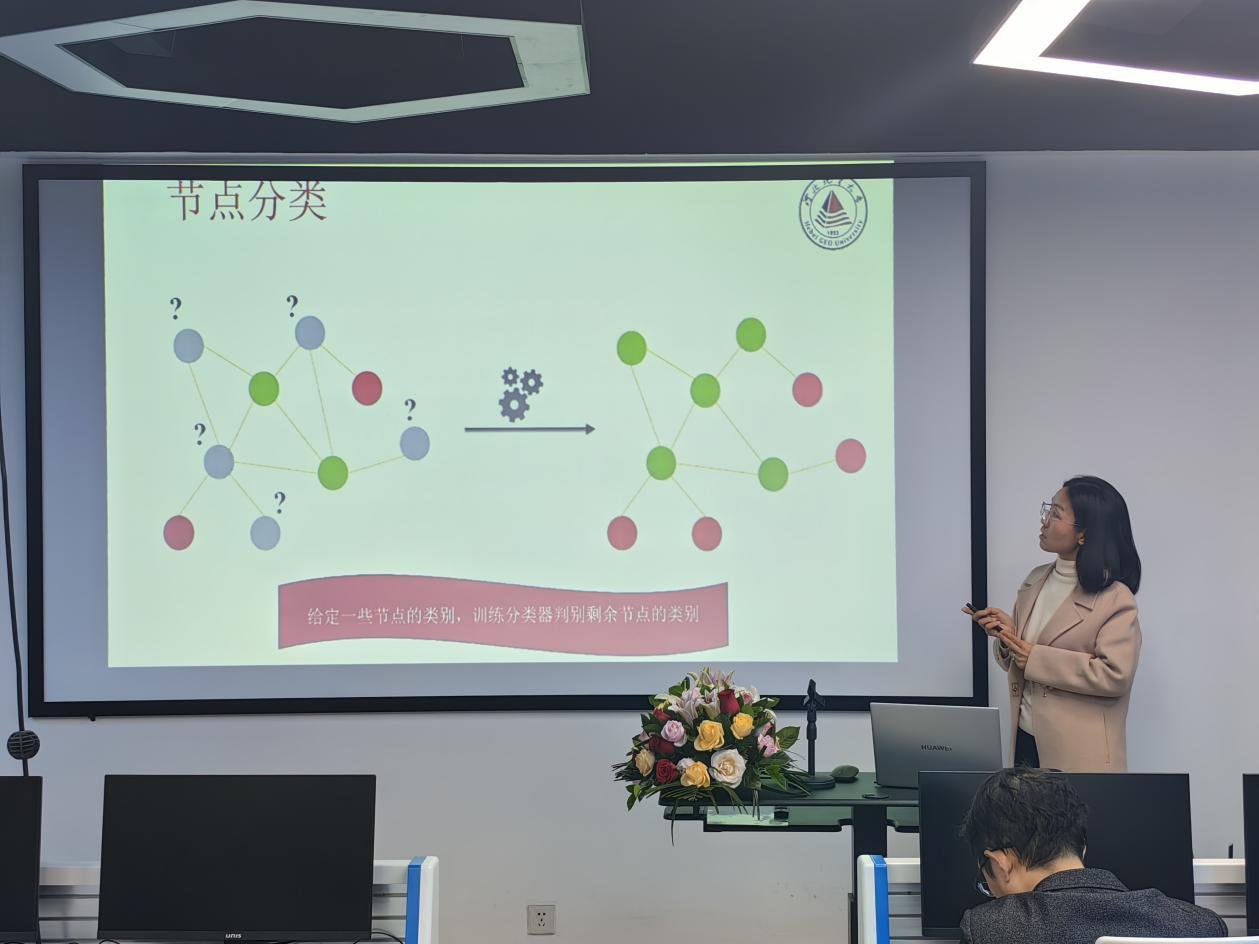 柴变芳教授作了“基于图神经网络的文本分类”的学术报告,介绍了文本分类的研究背景、图神经网络、基于图神经网络的深度图聚类和利用深度图聚类实现文本分类,对学生科普了关于机器学习领域研究工作内容。