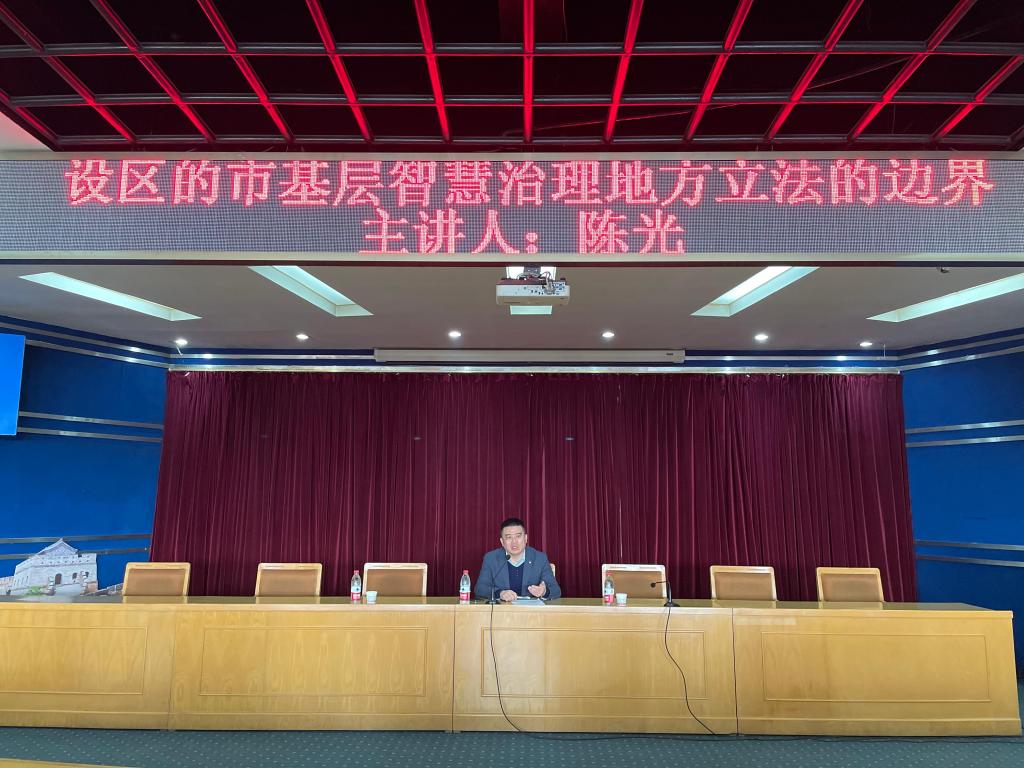 活动伊始,孙日华发表了致辞,并代表法政学院对陈光教授的到来表示欢迎。随后,陈光教授以《设区的市基层智慧治理地方立法的边界》为题,从基层治理法制化、法律与法治的关系,对智慧治理手段的限制、基层治理的边界等方面展开讲解,陈教授着重强调了智慧治理对基层治理的重要性,通过对《宪法》和《立法法》中相关法条的解读,提出了对基层法治边界要从理念、空间、事项三方面进行,从央地关系,政社关系的方面入手强调技术对治理有帮助更要有边界,最后陈光教授指出法学研究要多使用社会学的方法,这样能够更好的厘清法学与社会的关系。