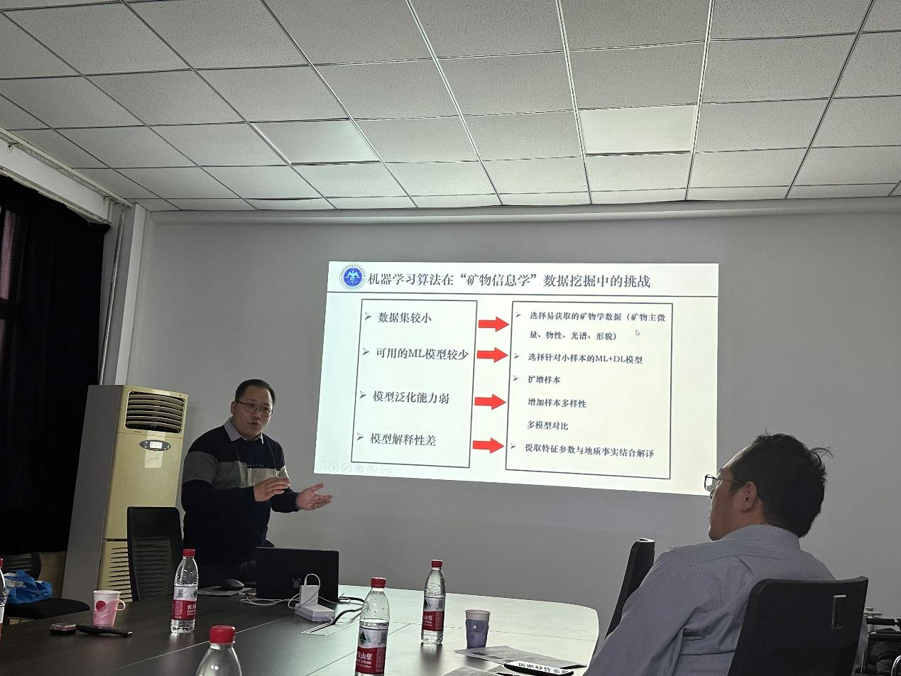 刘海明博士做了题为“机器学习算法在矿床勘探领域的初步应用”的学术报告,从为什么应用机器学习、什么是机器学习、如何进行机器学习和如何评价机器学习四个方面阐释了人工智能在地球科学研究领域的发展现状和趋向。
