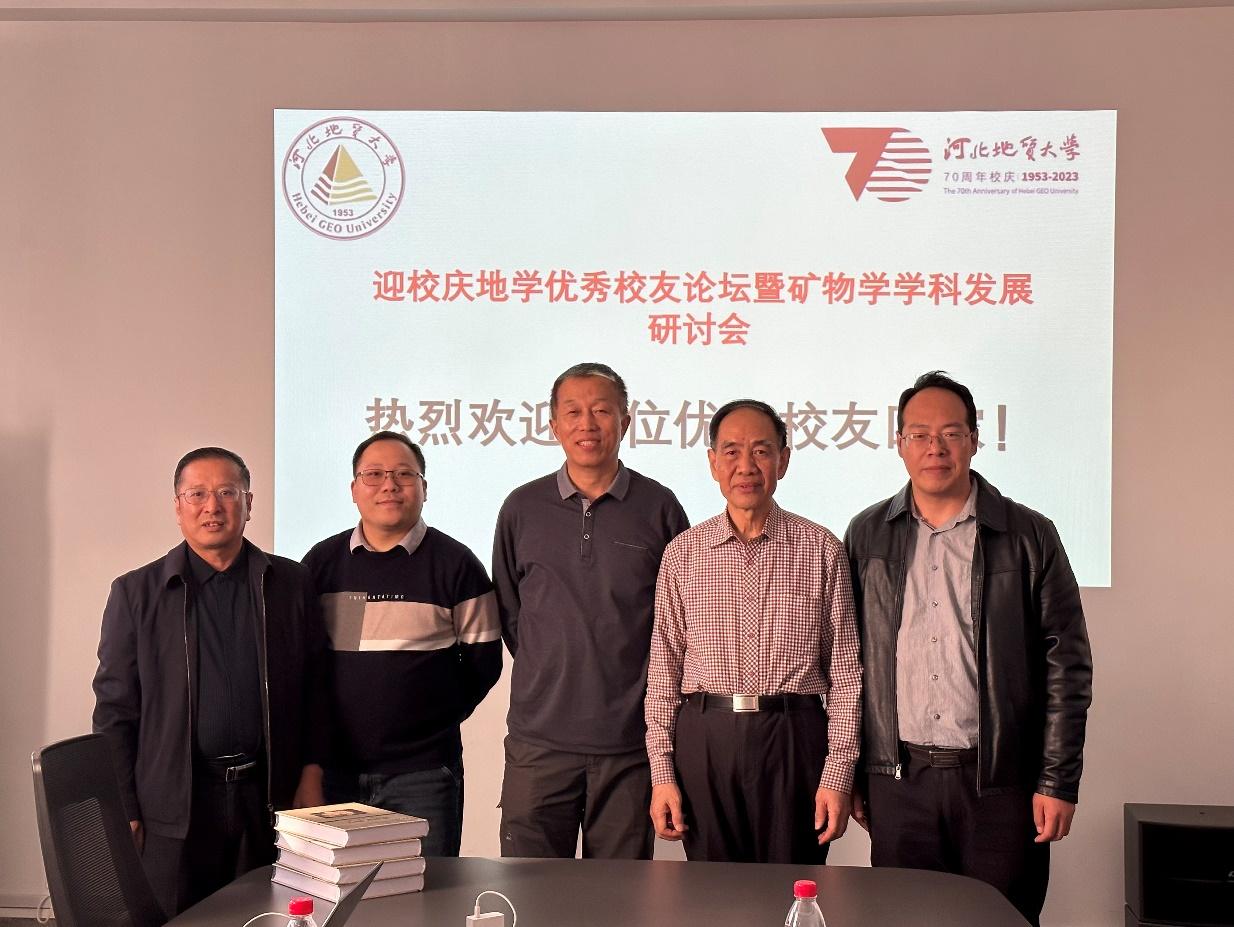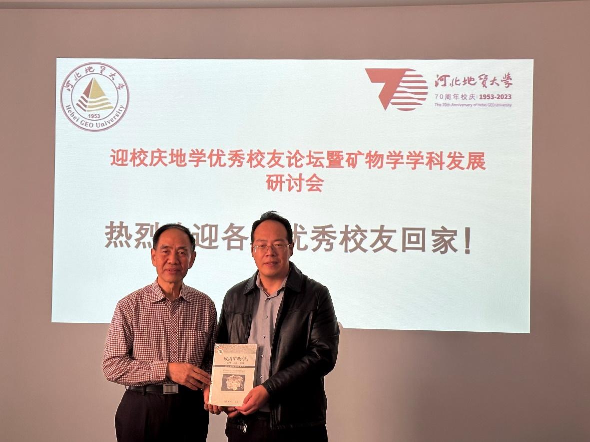 会前,李胜荣教授向母校捐赠了其重要著作《成因矿物学:原理,方法,应用》,曹静杰副院长代表学院向三位优秀校友赠送了70周年校庆的校徽。