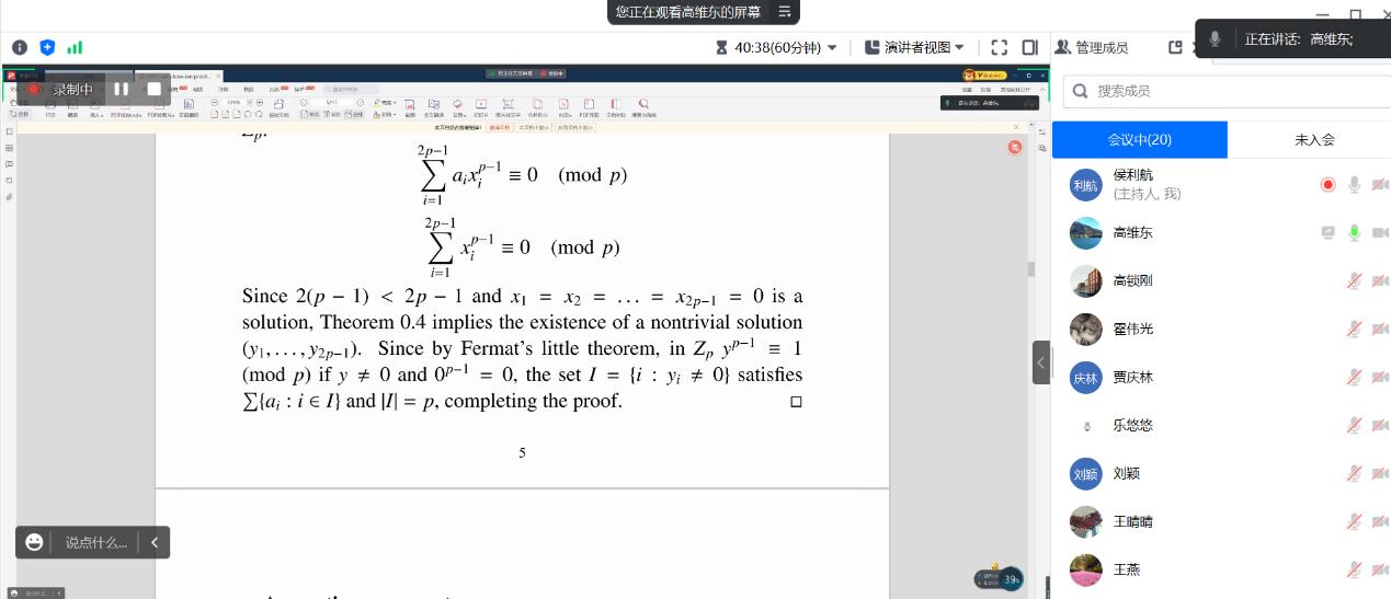 2023年6月12日,数理教学部邀请天津大学高维东教授为beat365师生作了题为《Erdos-Ginzburg-Ziv定理的十个证明》的线上学术报告。数理教学部部分教师和全体研究生参加了学术报告会。