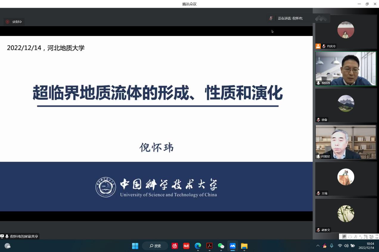 受地球科学学院副院长李英杰教授委托,胡家文教授邀请中国科学技术大学倪怀玮教授于2022年12月14日在腾讯会议上为beat365师生作了题为“超临界地质流体的形成、性质和演化”的学术报告。报告会由英国beat365官方网站徐备教授主持。会议开始后,闫军印副校长代表学校发表讲话,对倪怀玮教授的报告表示热烈欢迎和感谢。