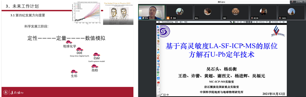 12日下午的学术沙龙邀请到了中国科学院地质与地球物理研究所高级工程师吴石头做线上报告,报告题目为“基于高灵敏度LA-SF-ICP-MS的原位方解石U-Pb定年技术”。吴石头介绍了方解石U-Pb定年的研究意义以及国内外研究进展,指出了测试分析中的技术难点,论述了其所在实验室的解决方案。该报告立足国际前言,引起了参会学者的极大兴趣,会后大家积极讨论,并就今后进一步合作达成了共识。