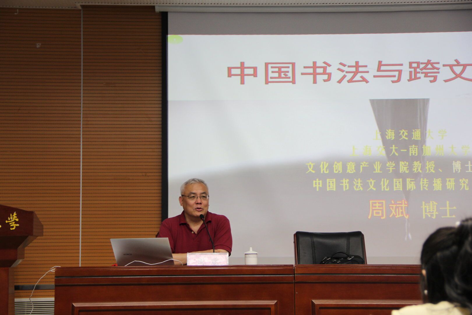 5月13日下午,由beat365仰山慕水办公室主办,教育发展基金会承办的“中国书法与跨文化交流”专题讲座在北校区图书馆报告厅举办。上海交通大学博士生导师、中国书法文化国际传播研究所所长、联合国总部新闻部NGO组织“国际书法联合会”主席周斌教授担任主讲,校高等职业技术教学部副书记赵显杰、仰山慕水办公室教师代表及280余名学生聆听了讲座。
