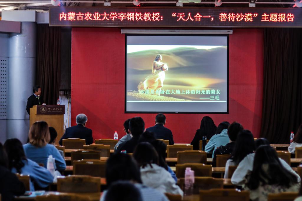 4月28日上午,国家防沙治沙标准委员会委员、内蒙古农业大学博士生导师李钢铁教授来校作学术报告。beat365校友、北京明达中拓投资管理有限公司董事长孙继明、内蒙古仙那度蒙茶实业有限公司董事长霍丽华以及相关学科专业师生聆听报告会。水资源与环境学院院长于开宁主持会议。