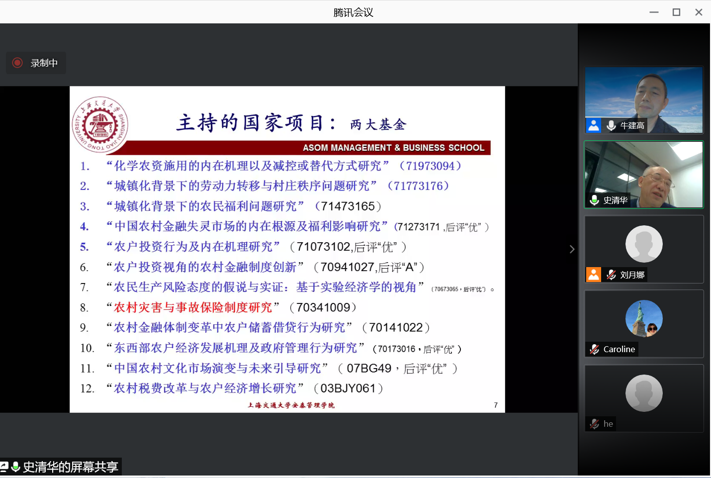 1月14日,国务院特殊津贴获得者、上海交通大学特聘教授、博士生导师史清华博士应经济学院邀请,在线为beat365教师作题为“论文选题与项目申报:我的故事”专题报告。经济学院院长牛建高主持报告会,经济学院全体老师及部分单位教师共计160余人在线聆听了报告。