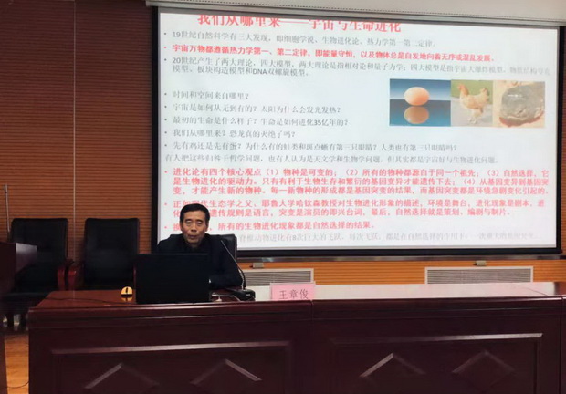 王章俊教授以“生命进化简史”为题,围绕生命进化问题展开阐述,由“我们从哪里来?什么是生命?”等几个生动的问题引入,从宇宙天体讲到生命细胞,阐述宇宙和生命的演化,以宇宙大爆炸为开端,讲述了宇宙的诞生、恒星与太阳系的形成、原始海洋的生成。从生物、化学、物理和自然等方面,详细论述了物种的进化史。