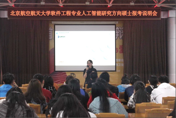 在讲座中,刘晶晶从考研政策解读、北航及北航软件学院简介、人工智能专业背景及发展趋势、北京航空航天大学专业优势等四方面对北京航空航天大学软件工程专业人工智能研究方向硕士招生做了简要分析;从学制、学费、考试科目、报考条件、名额分配、志愿调剂对北京航空航天大学软件工程专业人工智能研究方向硕士进行了专业讲解;并从社会发展趋势等方面说明了人工智能专业的前景。同时强调,北航软件学院是全国首个开设人工智能研究方向的高校,专业优势明显,拥有众多专业高端人才,并实行“双导师制”,校内导师与企业导师相结合,以提高学生的专业能力水平。在说明会问题答疑环节,刘晶晶对同学们提出的问题进行了详细的解答。伴随着大家热烈的掌声,北京航空航天大学软件工程专业人工智能研究方向硕士报考说明会圆满结束。
