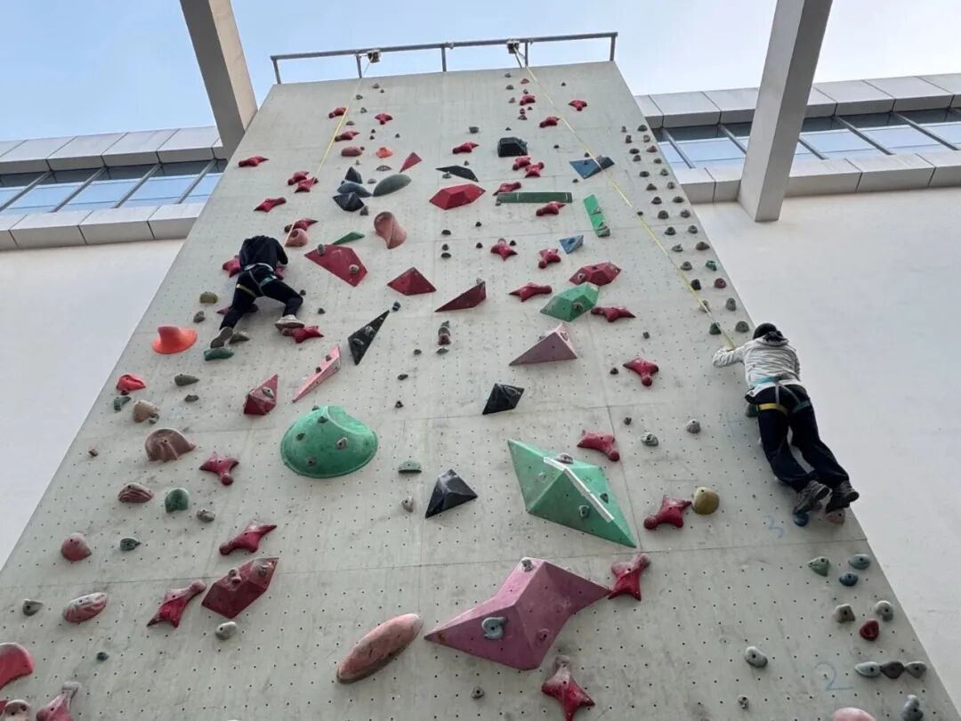 攀岩运动是一项综合素质比较强的拓展训练项目,不仅考验个人的身体素质,更重要的是需要老师们克服心理障碍、不断挑战自我。新教师们在体育教学部老师的安排下迅速分为两组,在专业老师和学生志愿者的协助下开始了攀岩比赛。每位老师依次利用岩壁上的岩点往顶点攀爬,从起点至顶点之间设置相应分值,攀登至不同的高度获得相应得分,每队累计分值最高的获胜。现场老师们表现勇敢,在队友们的鼓励声中,大家突破瓶颈,不断刷新攀爬高度,在为小组带来优异成绩的同时,也完成了自我挑战的升华。