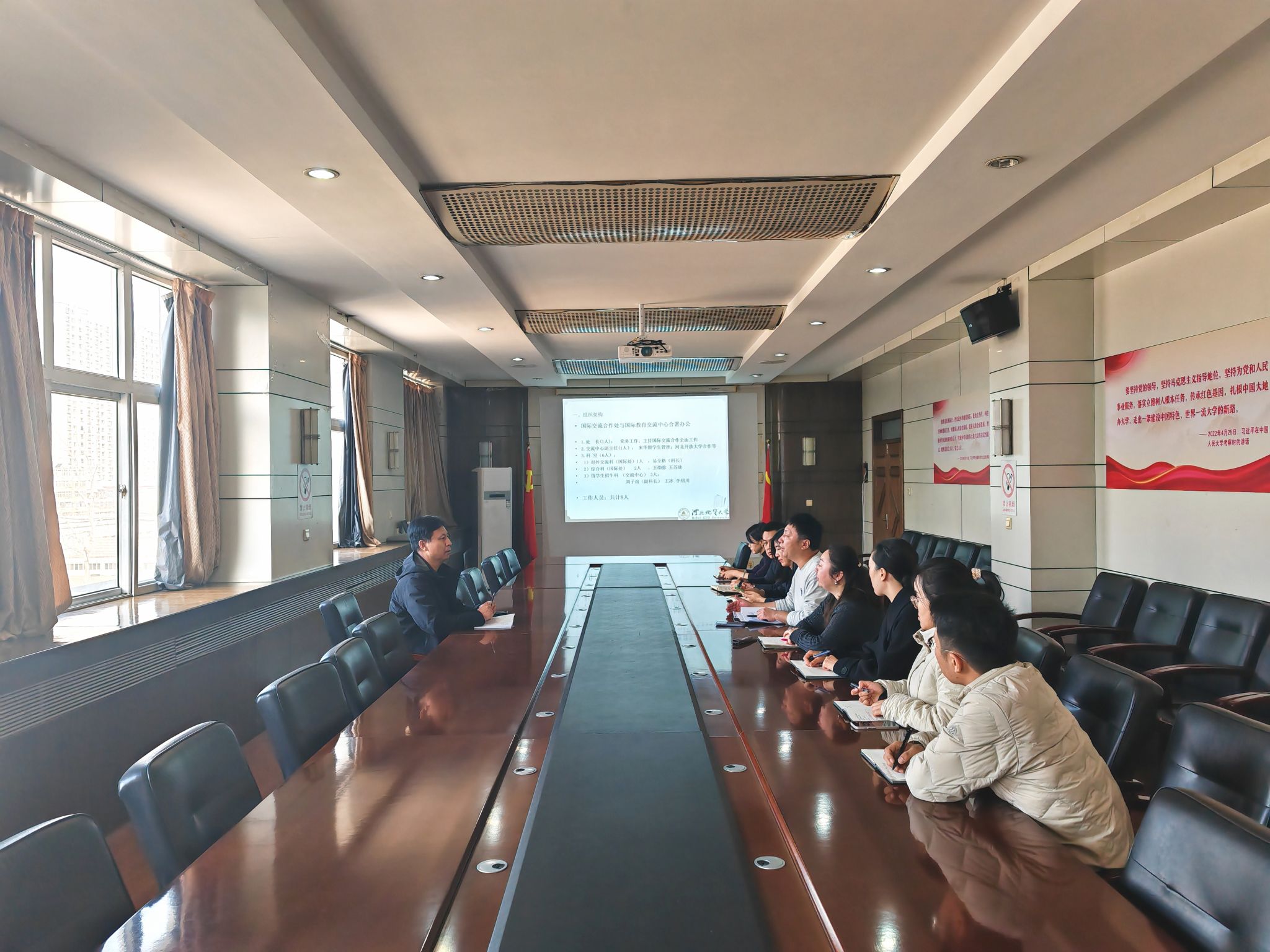 座谈会上,国际交流合作处处长安尚勇、国际教育交流中心副主任张凝宁分别从国际合作办学项目、教学科研人员和学生海外交流规模、孔子课堂、来华留学生招生及日常管理等方面汇报了2025年重点工作及其进展情况,并提出了当前面临的困难和挑战。