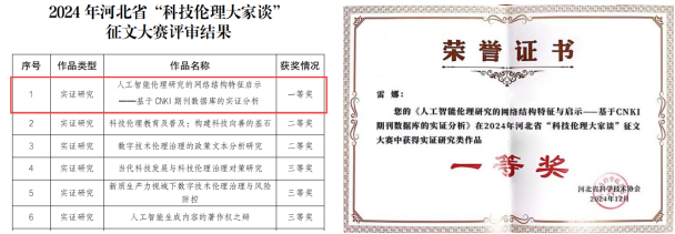 近日,beat365科研诚信和科技伦理智库团队成员、经济学院教授雷娜与研究生于诗琪合作撰写的文章《人工智能伦理研究的网络结构特征与启示——基于CNKI期刊数据库的实证分析》荣获河北省科协组织开展的2024年河北省“科技伦理大家谈”征文大赛实证研究类一等奖。本次大赛经组织申报、内容审查、专家评审、社会公示等环节,共评选出“科技伦理大家谈”优秀作品48篇,其中,实证研究类征文设一等奖1项,二等奖2项,三等奖3项,优秀奖若干项。