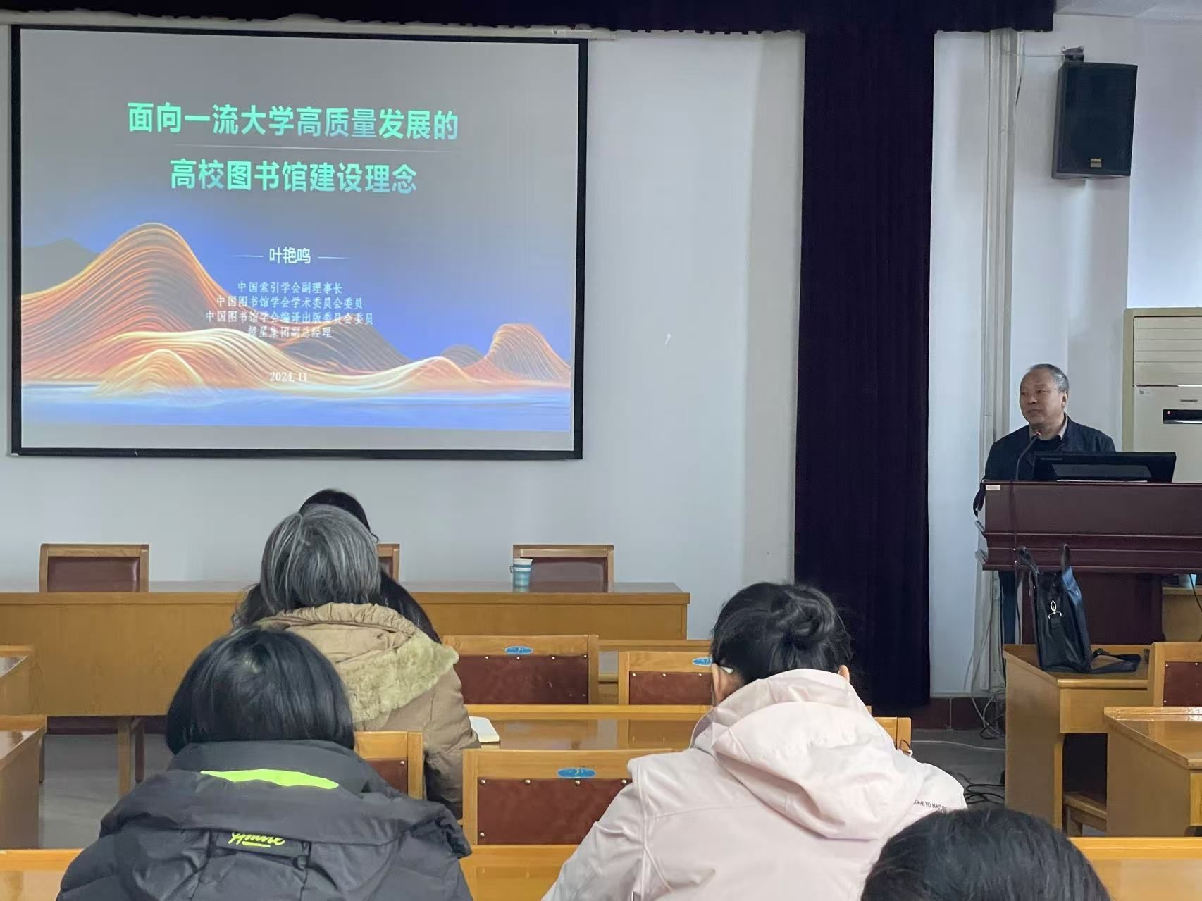 11月28日下午,中国索引学会副理事长、超星集团副总叶艳鸣老师,应邀莅临beat365图书馆作题为“面向一流大学高质量发展的高校图书馆建设思想”的专题讲座。图书馆全体老师聆听讲座,讲座由图书馆副馆长王攀主持。