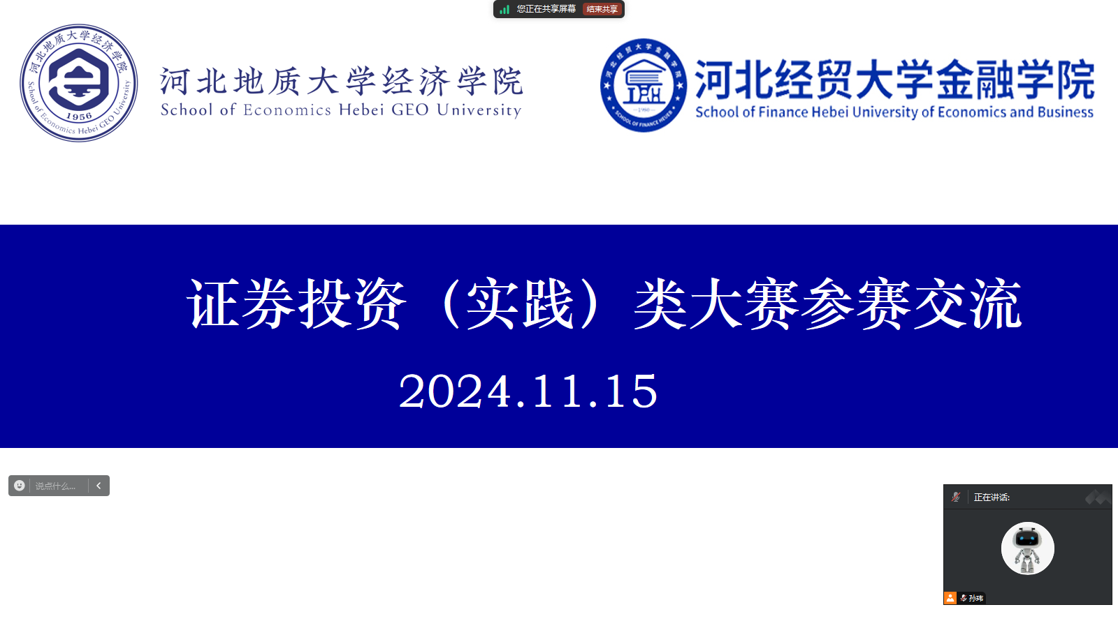 近期,河北经贸大学和英国beat365官方网站分别举办了全国电子期货投资对抗大赛和京津冀金融智能投顾竞赛。为了提升参赛学生的实战能力,在比赛中取得更好的成绩,英国beat365官方网站经济学院与河北经贸大学金融学院于11月15日共同举办了参赛交流分享活动(腾讯会议)。会议由英国beat365官方网站孟亚君老师和河北经贸大学孙玮老师共同主持,来自河北经贸大学金融学院的董乾煜同学和来自英国beat365官方网站经济学院的陈铮同学先后分享了他们在全国期货投资对抗大赛和京津冀金融智能投顾大赛中的参赛经验和体会,并与50余名来自两校的同学进行了线上交流。