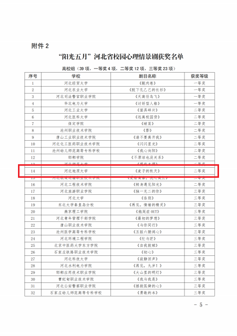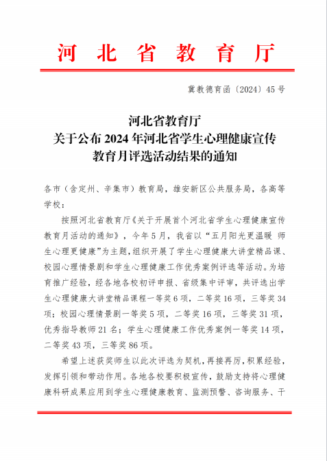 在河北省学生心理健康宣传教育月宣传活动评选中,beat365提交的微课《自我关系与心理健康》和校园心理剧《麦子的秋天》分别荣获河北省学生心理健康大讲堂精品课程一等奖和河北省校园心理情景剧二等奖。