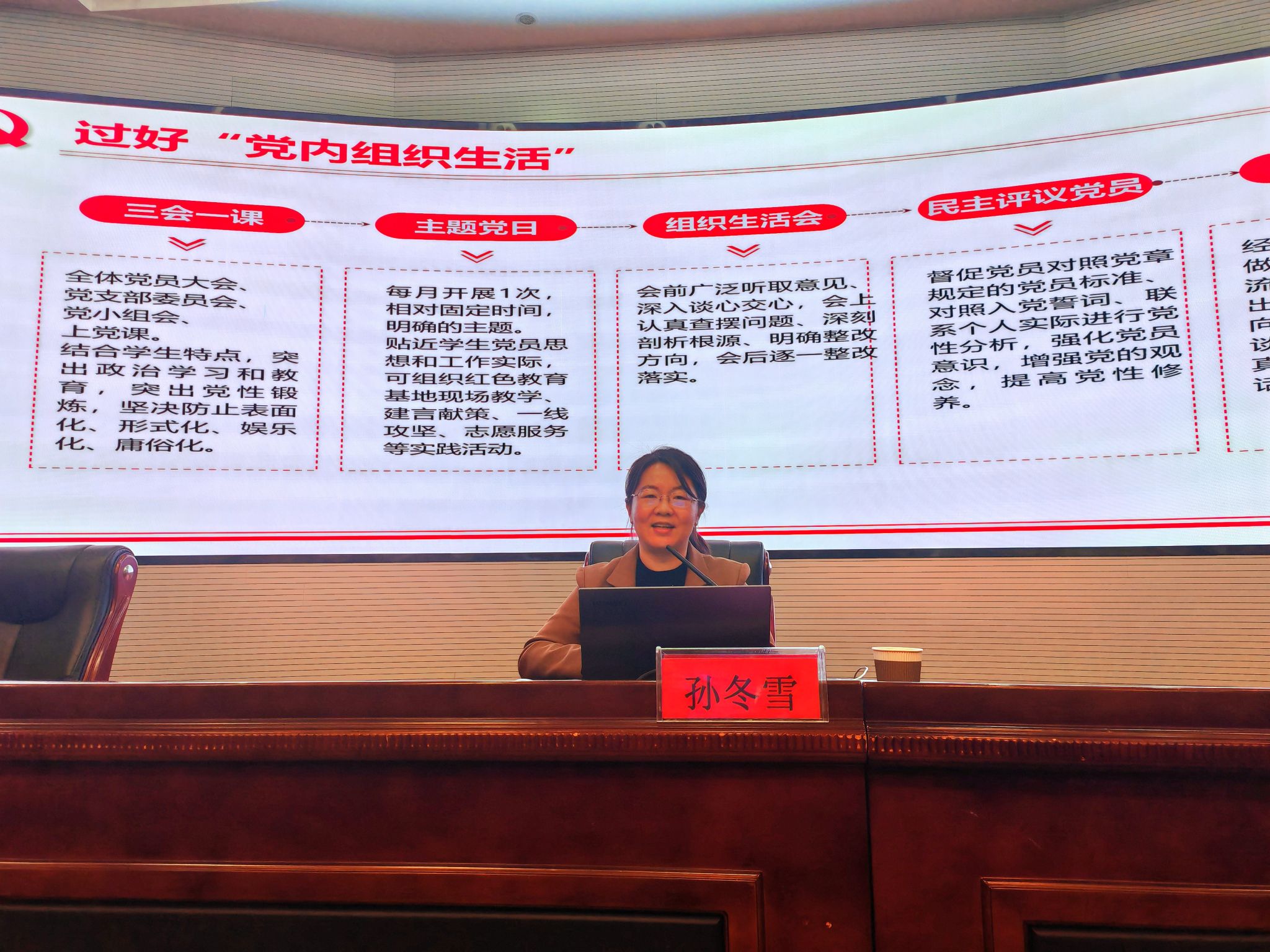 孙冬雪以《夯实支部标准化规范化建设基础,打造党建“双创”和“领航工程”样板》为主题,重点围绕党支部标准化规范化建设、发展党员工作规范、“三会一课”等组织生活制度落实、党建“双创”“领航工程”典型经验等四方面内容进行了详细的解读和分享。