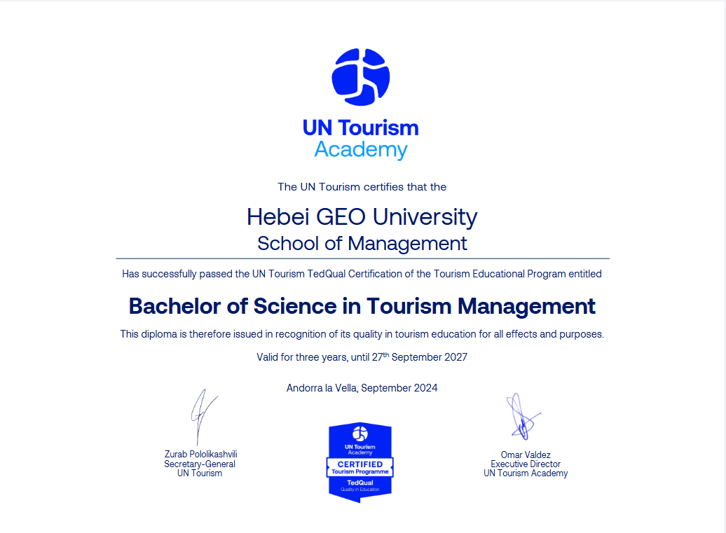 世界旅游组织旅游教育质量认证体系(UNWTO TedQual Certification System,简称UNWTO.TedQual认证)是由联合国世界旅游组织颁发的唯一和权威的全球旅游类教育质量认证,旨在提高全球旅游教育、旅游培训及旅游研究项目的质量,推广全球旅游伦理道德规范,对评价和提高旅游院校的教学及综合管理水平具有重要意义,在旅游教育的质量监控、程序标准化、内容品质化和视野国际化方面均具有极高的显示度。获得世界旅游组织的教育质量认证已经成为全球一流旅游院校的重要评价标准。